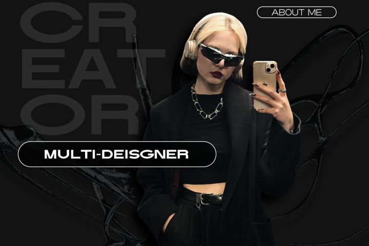 В основу визуальной концепции легла актуальная Y2K-эстетика, которая созвучна авторскому стилю и создаёт запоминающийся образ. Дизайн выполнен в контрастной тёмной палитре, подчёркивающей графичность и динамику. Типографика и компоновка контента выдержаны в минималистичной манере, что обеспечивает ясность восприятия и фокусирует внимание на ключевых элементах: проектах, методологии работы и контактных данных.