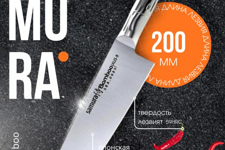 использованы визуальные акценты: контрастный фон, оранжевый круг для выделения длины лезвия, элементы кулинарной тематики (зелень, перец, специи) для ассоциации с готовкой;