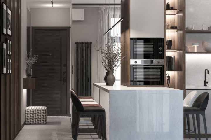 Апартаменты 90 кв.м. сложной круговой планировки. Единственный плюс - остекление в пол. Цель была создать комфортное пространство кухни-столовой, соединённой с уютной гостиной и отдельным помещением для спальни.