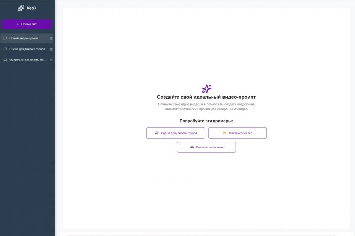 На основе документации для Veo был определен ряд ключевых параметров которые необходимо передать в модель для генерации качественного реалистичного ролика. Нами был написан софт - ИИ ассистент который может как самостоятельно сгенерировать профессиональный промпт (необхоимо только задать начальную тематику) так и в режиме диалога с пользователем заполнить каждый параметр промпта). Ассистент - мультиязычный, однако для лучшего результата итоговый промпт всегда генерируется на английском языке.