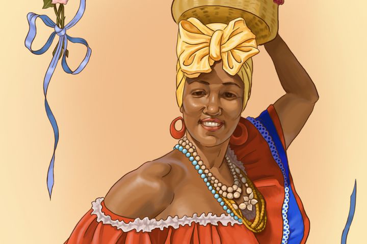 На Кубе много ярких красок и цветов и колоритных дам, поэтому я решила нарисовать кубинку с корзиной цветов.
