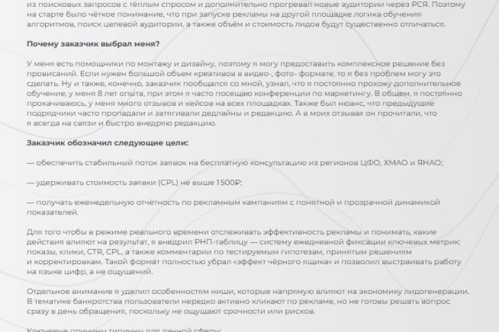 Проект показал, что в нише банкротства физических лиц стабильный результат невозможно получить за счёт рекламы в лоб и агрессивных офферов. Чувствительность тематики, строгая модерация и психологические барьеры аудитории требуют системного и аккуратного подхода.