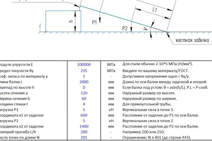 Вводим в поля имеющиеся данные с рисунка (Модуль упругости (сталь3), L, P, h и другие).