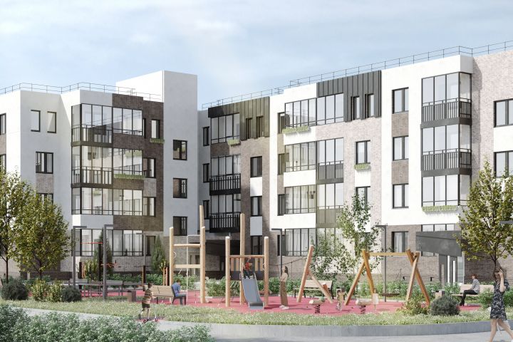 Визуализировать территорию: дворы в формате «дом-двор-дом» с пешеходными зонами, детскими площадками, зеленью; условно показать общественные объекты (ТЦ, детские сады, школа и т.д.); инфраструктуру (парковки, кольцевые развязки).