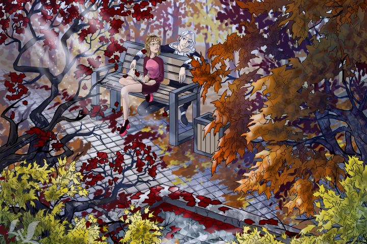 Были изучены формы осенних листьев, проведена работа с освещением, цветовой гаммой и воздушной перспективой. В центре композиции расположены двое студентов. Погода еще теплая, но листья уже успели приобрести яркие краски осени