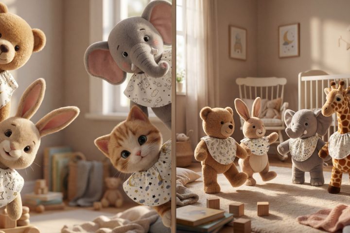 мягкие игрушки выступают в роли «детской компании», через которую демонстрируются товары (пелёнки, слюнявчики, салфетки). Каждая игрушка — отдельный персонаж со своей «личностью», что позволяет: