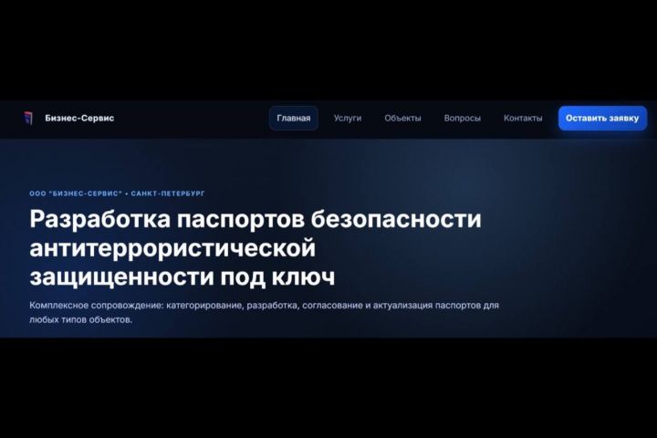 Цель — создать профессиональный, информативный и продающий сайт для компании, специализирующейся на разработке паспортов безопасности антитеррористической защищенности. Сайт должен был презентовать сложную юридически значимую услугу в понятном для владельцев бизнеса формате, демонстрировать экспертность компании, подробно объяснять процесс работы и стать основным инструментом для генерации заявок от клиентов из различных сфер (ритейл, медицина, образование, промышленность и др.).