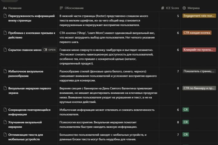 Был создан агент, который по клику может делать скриншот страниц сайта, проводить детальный анализ страницы и вносить в базу данных Notion предложения по улучшению UX/UI