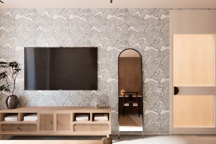 Спальня: Светлая и просторная комната с акцентной стеной, вдохновленной традиционным японским искусством (мотивы волн и природы). Стена визуально расширяет пространство, создавая ощущение бесконечного океана и свежести. Интегрированы TV-зона, хранение и уютные детали для отдыха.