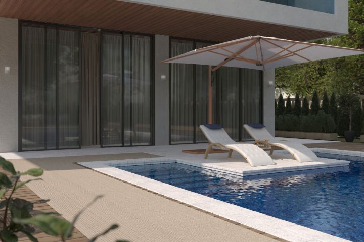 Задачей проекта было создание серии визуализаций загородного бассейна с прилегающим участком для демонстрации специализированного покрытия, используемого по периметру чаши. Клиенту было важно показать материал не изолированно, а в реальной архитектурной и ландшафтной среде, чтобы подчеркнуть его функциональные и визуальные качества.