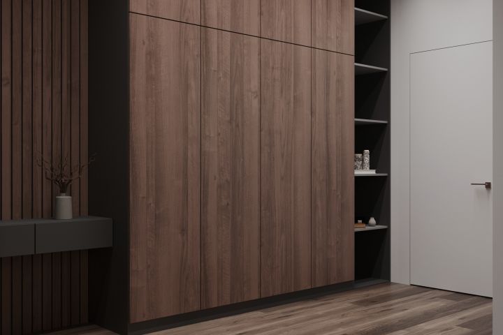 Задача была в создании красивого и простого интерьера прихожей для загородного дома, закрытое хранение и интересное решение подсветки и покрытий