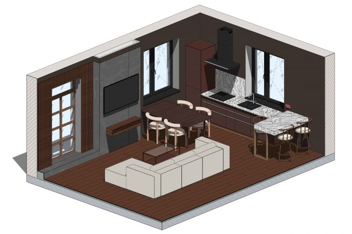 3D схема кухни-гостиной и спальни с интересным планировочным решением в виде застекленной ванны прямо в спальной зоне. Создавалось с помощью программы Revit