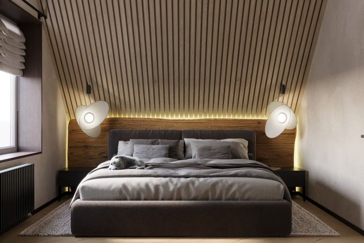Главная задача - обыграть мансардный потолок и добавить природные акценты