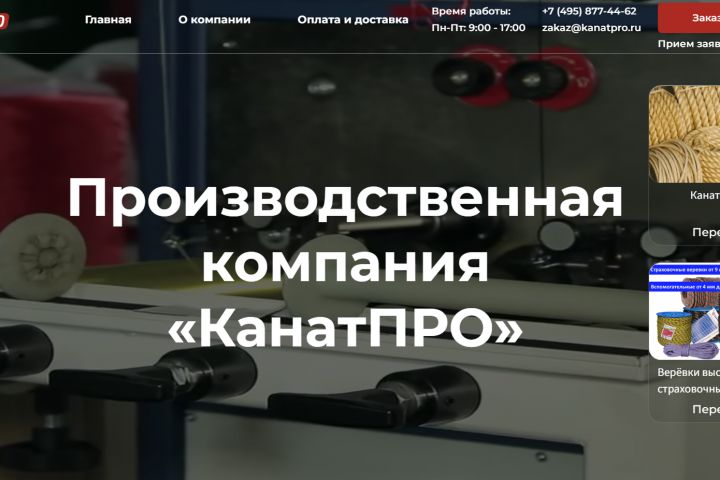 Мы создали лаконичный сайт с каталогом продукции: от технических верёвок до декоративных лент. Сделали удобную структуру и форму для заявок, добавили акценты на преимущества производителя.