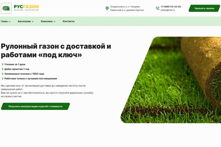 Сайт выполнен в зелёной цветовой гамме с акцентом на преимущества: укладка за 1 день, гарантия, опыт с 1992 года. Добавлены блоки с услугами, вариантами доставки и формами для быстрого расчёта. Визуал построен на фотографиях живого газона, что усиливает доверие.