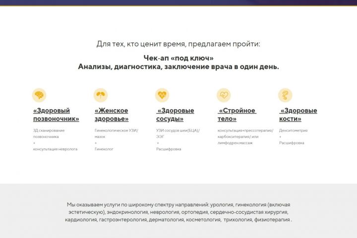 Разработка прототипа. Создание макетов главной и внутренних страниц, визуальной концепции, которая соответствует фирменному стилю и ожиданиям пациентов.