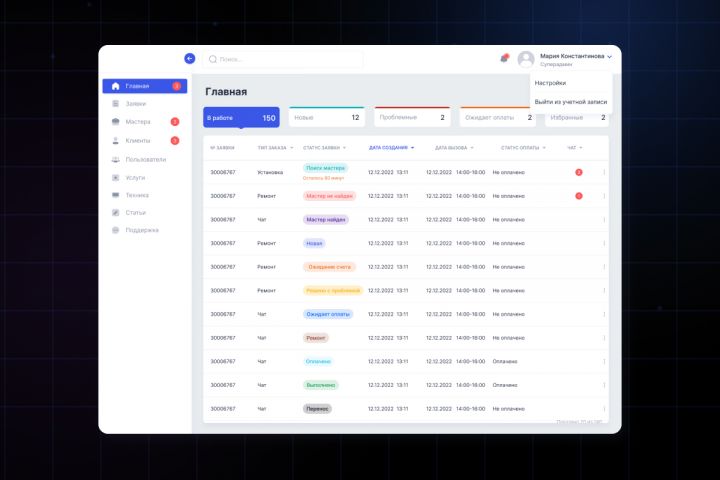 В системе реализованы: распределение заявок между мастерами, контроль статусов и сроков, детальные карточки заказов с историей изменений и коммуникаций, база клиентов и техники, каталог мастеров с профилями, графиками и рейтингами, гибкая ролевая модель доступа, встроенные чаты и модуль ручного создания заявок для обращений по телефону.