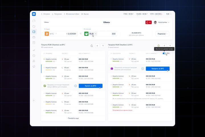 Платформа позволяет пользователям размещать объявления с гибкими условиями обмена, настраивать курсы (фиксированные или привязанные к биржам), лимиты, способы оплаты и требования к контрагенту. Реализованы умный поиск и расширенная фильтрация по валютам, курсам, рейтингам, верификации и другим параметрам.