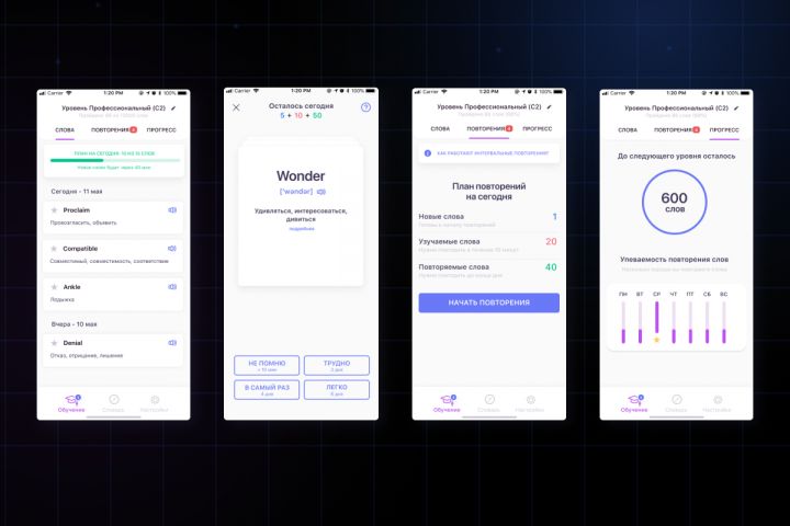 Задача — создать продукт, который не требует от пользователя отдельного времени на старт обучения. Вместо классического формата «открой приложение и учи», слова сами приходят через push-уведомления в течение дня. Каждый полученный термин автоматически добавляется в персональную базу и закрепляется через продуманную систему повторений.