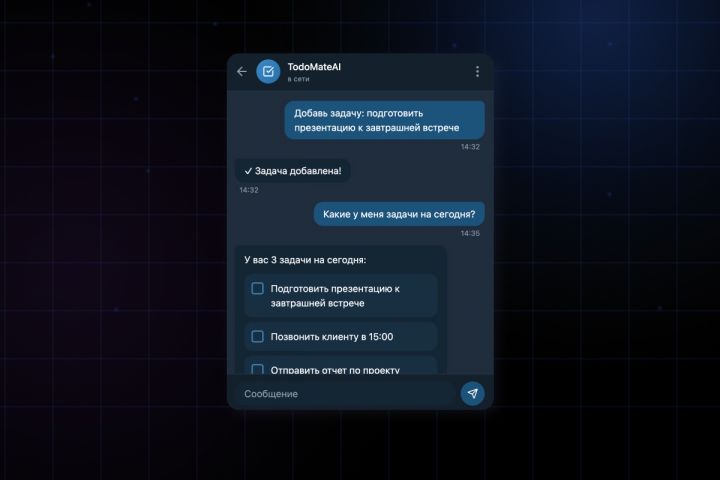 Основная идея — работать с задачами там, где уже происходит коммуникация. Пользователь может ставить, редактировать, искать и закрывать задачи в свободной текстовой форме прямо в чате с ботом. ИИ-агент распознаёт интент, извлекает параметры (сроки, исполнителей, проекты, напоминания) и сопоставляет запрос с бизнес-логикой платформы.