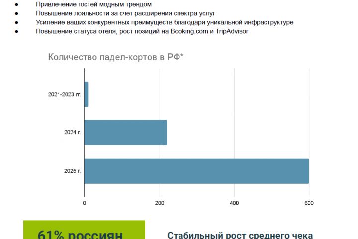 Подготовка коммерческого предложения для компании, занимающейся обустройством кортов для падел-тенниса. Заказчик предоставил наброски и вводные. Задача - подготовить на их основе КП, рассчитанное на владельцев отелей, которым будет выгодно установить на своей территории падел-корт. КП планировалось для рассылки по холодной базе, цель - выезд на замер.