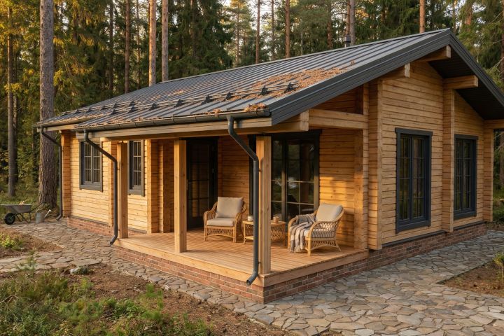 Задача от застройщика - создать реалистичную визуализацию дома из бревна на основе существующего вида из архитектурной программы. Два вида с двух сторон, с сохранением визуальной идентичности.