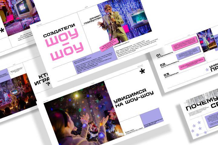 Я подробно расспросила клиента о проекте, выбрала наиболее удачные фото. Из всего объема текста, отправленного мне клиентом, я вычленила самое важное, разбила на слайды. Выбрала наиболее подходящий духу шоу-проекта стиль необрутализм и в соответствии с ним оформила презентацию - разработала модульную сетку, подобрала шрифты, цвета и геометрию.