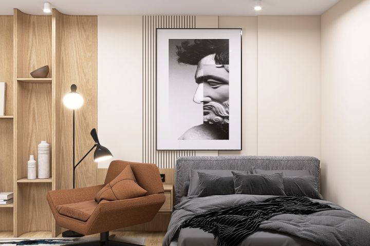 В спальне предусмотрено рабочее место, кресло для отдыха и стеллаж для книг и мелочей. В нише в глубине комнаты даже удалось спрятать небольшую гардеробную
