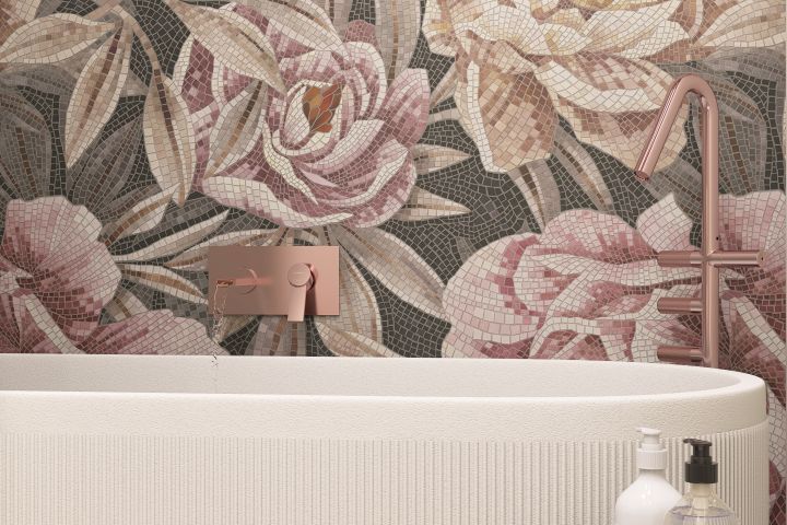И, конечно, ключевой акцент в интерьере этой ванной - это невероятно красивое мозаичное панно от Kerama Marazzi, которое отлично сочетается со столешницей из розового кварцита и потолком