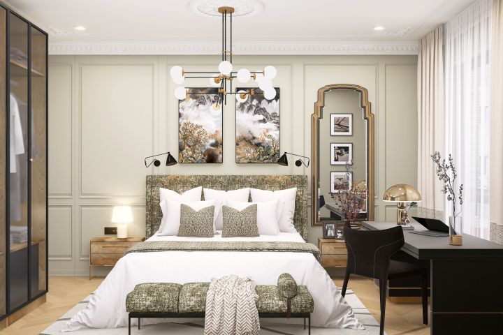 Общие тона приглушены, стены окрашены в светлые, почти белые оттенки для получения максимального количества естественного света. Предпочтение отдано натуральным, тактильно приятным материалам. Простые окрашенные стены, дубовый паркет, молдинги…