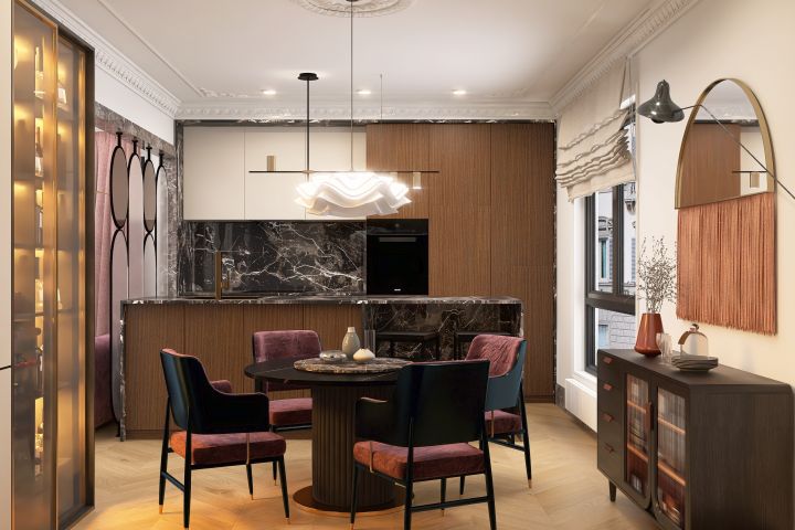 Акцентом стал современный декор, с вкраплениями винтажа, а использование в отделке натурального камня и дерева добавило интерьеру глубины и динамики