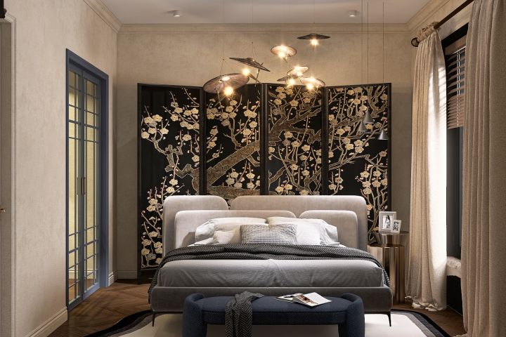 Современная спальня с винтажными нотами. Главный акцент в интерьере этой спальни, конечно же, ширма невероятной красоты
