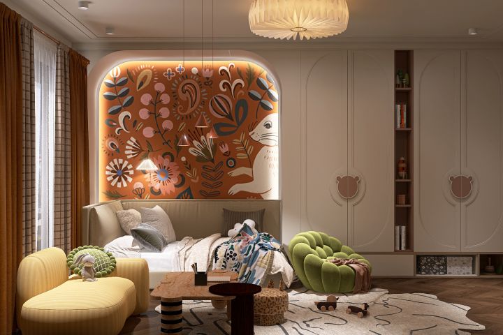 Яркая комната для девочки, в которой удалось выделить разные зоны для игр и даже разместить игровой комплекс