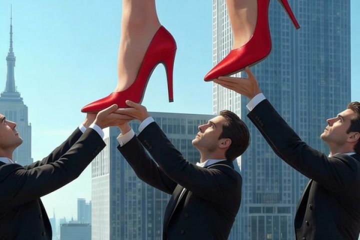 Возник образ женских туфель, на фоне небоскрёбов. Потом этот образ дополнил руками восхищённых мужчин.