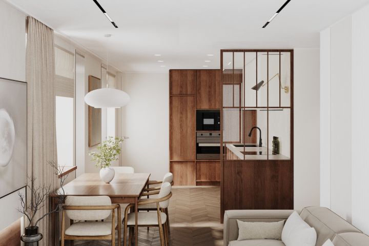 В этом проекте основной задачей было создать уютный и комфортный интерьер, а также визуально разделить вытянутое прямоугольное пространство на отдельные функциональные зоны. Помимо этого было важно сделать квартиру легкой для дальнейшей адаптации к семейной жизни.