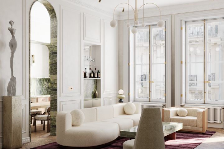 Общая стилистика квартиры отсылает к историческому контексту здания, при этом мебель отличается современными формами и актуальной цветовой палитрой. На фоне светлых, преимущественно белых стен в интерьер были введены насыщенный зелёный и контрастный ему фиолетовый цвета, которые усиливают выразительность пространства, не разрушая его целостность.