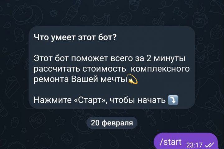Стоимость ремонта — это Telegram-бот, разработанный для быстрого и удобного расчета стоимости ремонтных работ и услуг.