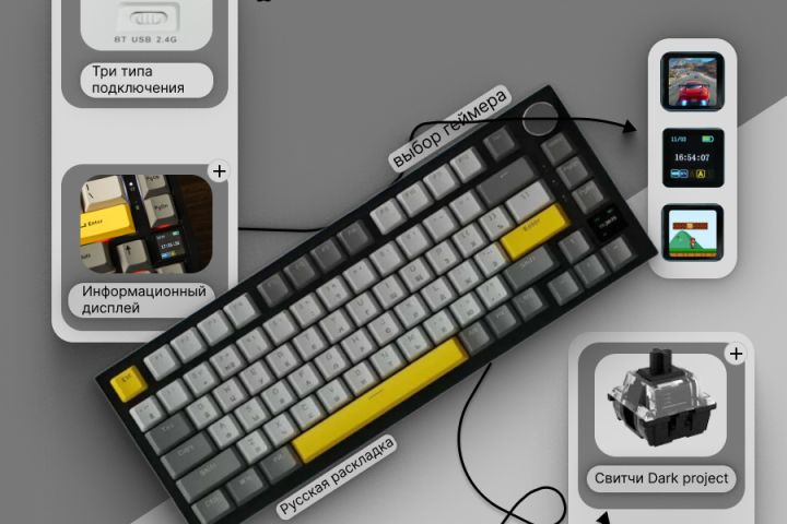 Задача была создать карточку товара для игровой клавиатуры ajazz и так как продавец только выходил на рынок моей задачей было сделать карточку не похожей на остальные чтобы она выглядела строго но при этом свежо чтобы завлечь геймеров и обычных пользователей