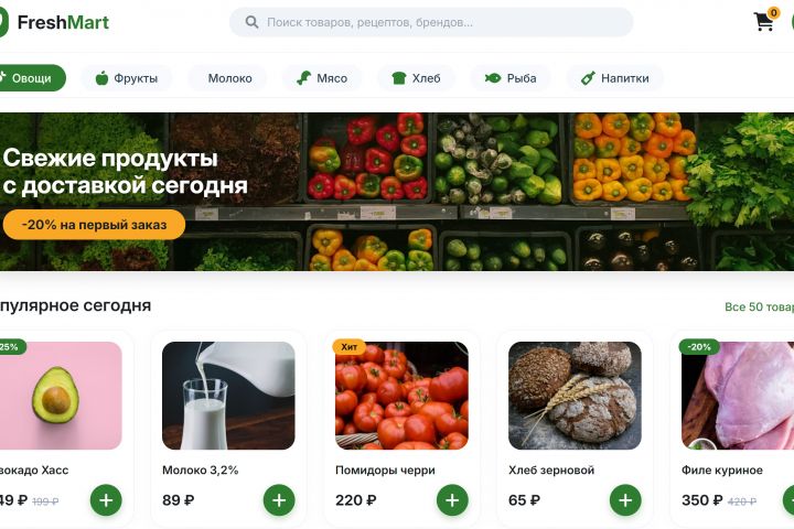 Важно было создать не просто очередной маркет, а сервис, которому доверяют: с понятным интерфейсом, крупными элементами для старшего поколения, блоками свежести и реальными отзывами. Также требовалось продумать мобильную версию (mobile-first) и систему лояльности, чтобы удержать покупателей.
