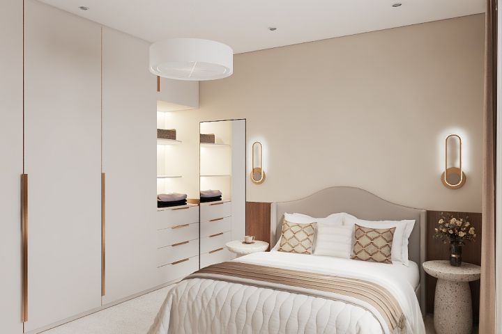 Акценты в интерьере выполнены в природных цветах и темных оттенках, что добавляет глубину и интерес к общему дизайну. Освещение продумано до мелочей: точечные светильники обеспечивают основное освещение, а подвесные светильники у кровати и освещение у макияжного столика создают комфортную атмосферу для вечернего отдыха и утренних ритуалов.