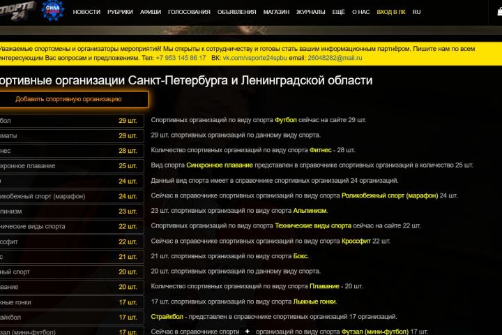 Заказчику требовался полный и структурированный каталог всех спортивных организаций Санкт-Петербурга и Ленинградской области: спортивные школы, секции, клубы, федерации, центры подготовки. Основная сложность — данные разрознены по тысячам сайтов, справочников и городских порталов, часто устаревшие или неполные. Необходимо было не просто разработать сайт, но и наполнить его актуальной информацией с привязкой к 234 видам спорта.