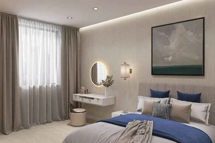 Цветовая гамма построена на сочетании бежевых, серых и синих оттенков, что создаёт баланс между спокойствием и выразительностью. Интерьер выглядит лаконично, но не холодно — благодаря текстилю и мягким фактурам.