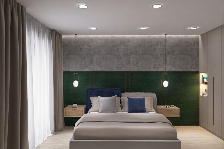 Спальня — лаконичная, с большой кроватью у стены, минималистичными прикроватными тумбами и акцентной зелёной панелью за изголовьем. Пространство не перегружено, создаёт атмосферу спокойствия и уюта.