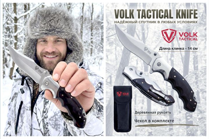 Покупатель видит нож и сразу понимает: богатая комплектация — не маркетинг, а реальное преимущество. Дерево, сталь, надёжный замок — всё это складывается в образ инструмента, которому можно доверять.