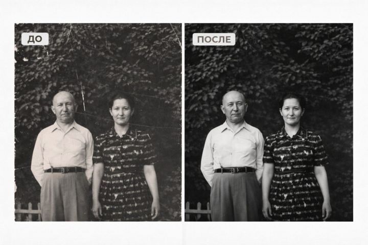 В результате выполнена полная визуальная реставрация архивного снимка: устранены трещины, разрывы и дефекты поверхности, восстановлен утраченный фрагмент изображения, выровнен тональный баланс и повышена читаемость деталей.