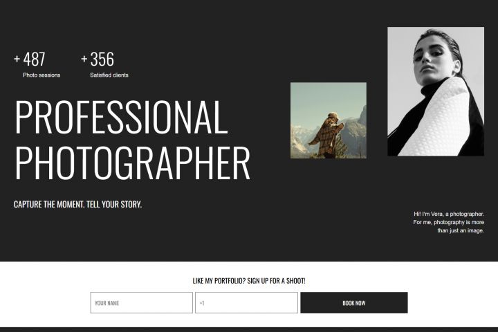 Создать сайт для фотографа с главной страницей, страницей с портфолио, контактными данными. Макет был предоставлен заказчиком, верстку нужно было исполнить с соблюдением Pixel Perfect.