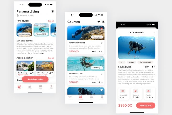 Спроектировал мобильное приложение для школы дайвинга. С помощью приложения пользователь может выбрать наиболее подходящие курсы или мастер-классы и записаться на них.