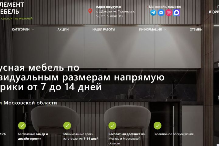 «Элемент Мебель» занимается изготовлением и продажей кухонь и шкафов-купе по индивидуальным заказам.