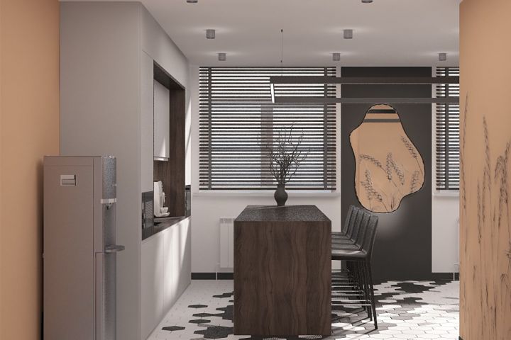 С помощью полубарной стойки и нескольких столов удалось как визуально разделить пространство комнаты на зоны, так и решить поставленную Заказчиком задачу.