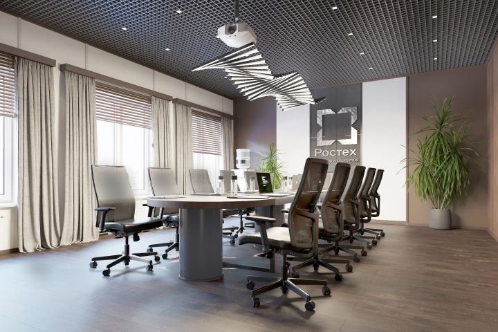 Выполнена разработка офисной части компании с проработкой кабинетов общего назначения (переговорная, кабинет руководителя, ВКС и др.) в двух вариантах оформления для утверждения бюджета.